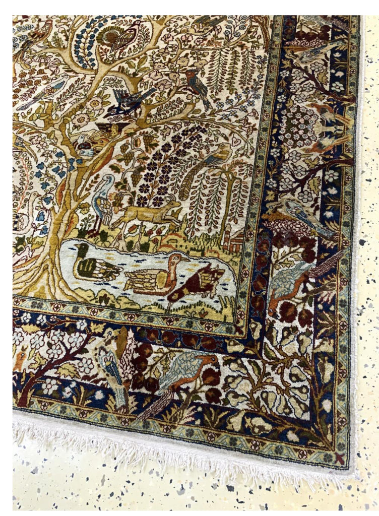 EGYPTIAN kashan design SILK, VERY FINE, TREE OF LIFE, # gRre, SIZE, 3’5”x5’3” BIRDS OF PARADISE, PURE SILK ON SILK FOUNDATION.